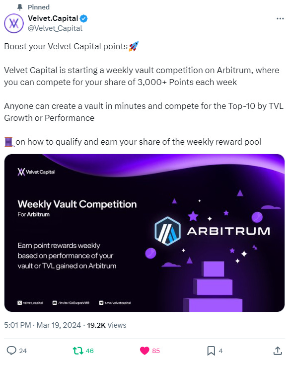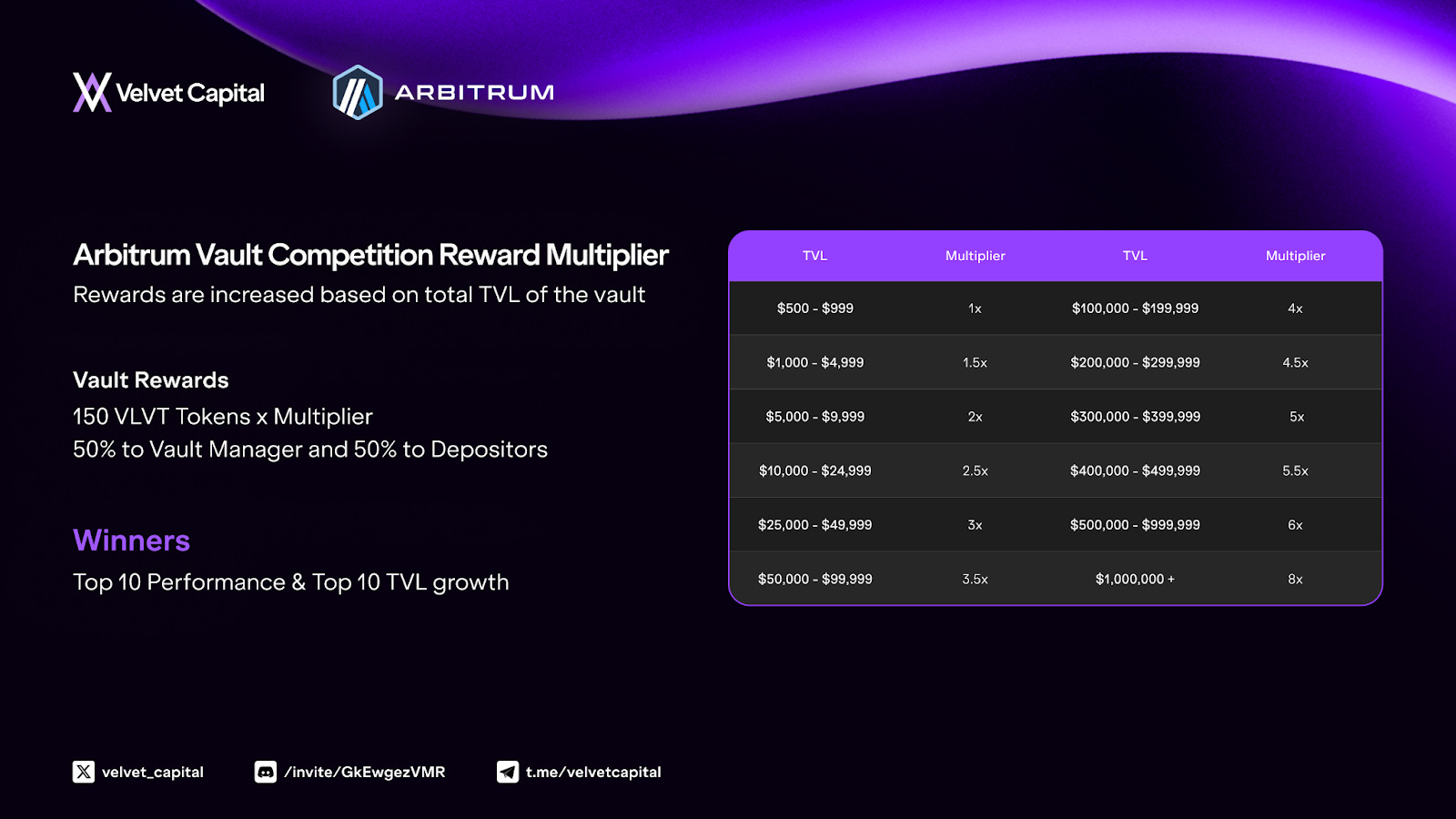 Join the Vault Competition today by having $500 TVL by Vault Manager, Liking & Retweeting the kickoff post, and competing to be in the top 10 in TVL increase or NAV increase each week for points!