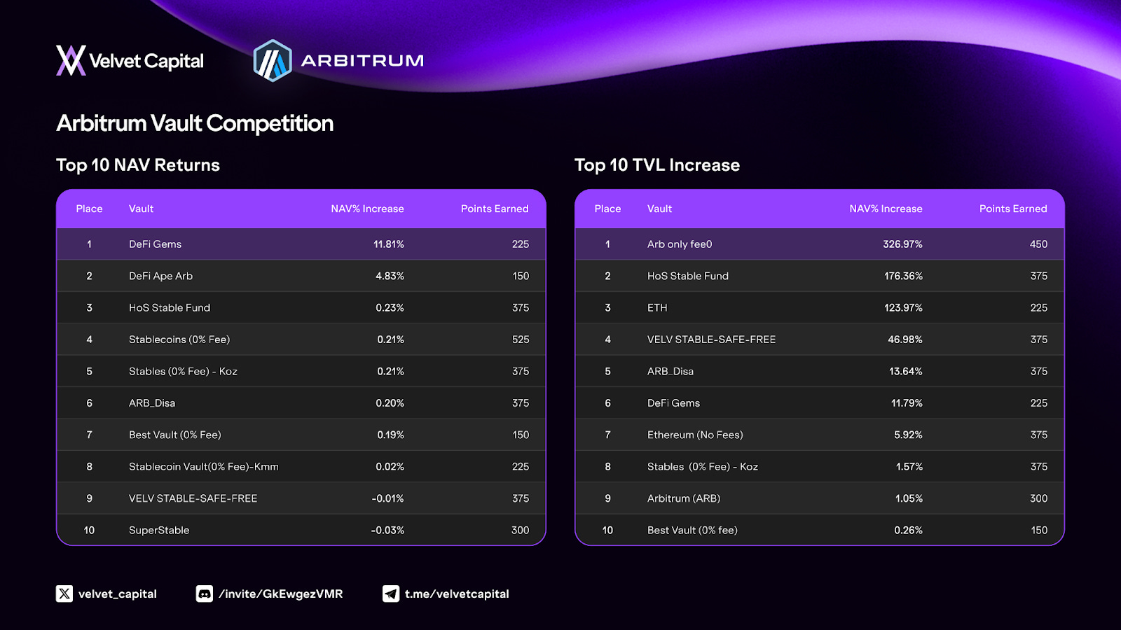 Last week, we began our Arbitrum Vault Competition where from every Wednesday to Wednesday we will reward the 20 vaults based on TVL gains and NAV increase.