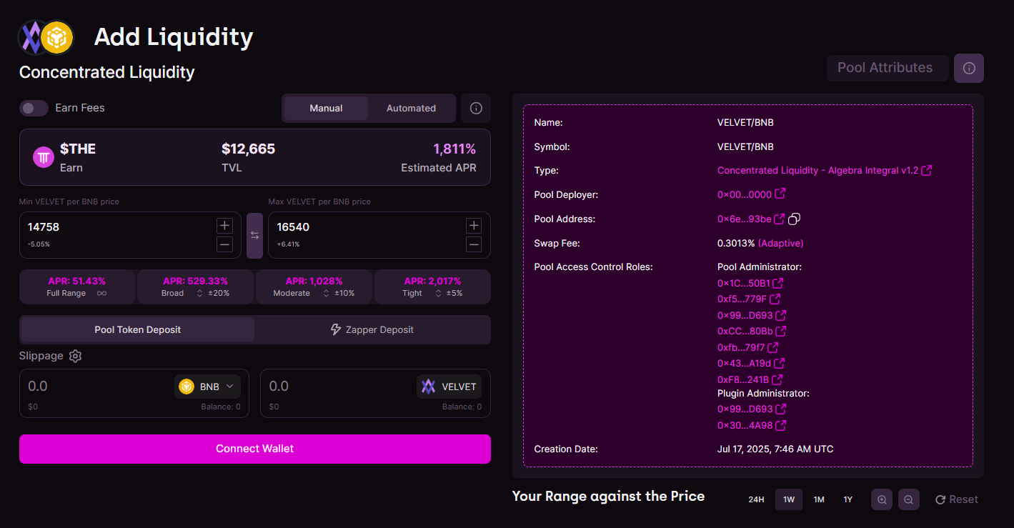 We've teamed up with Thena to launch an official $VELVET / BNB Concentrated Liquidity (CL) pool, giving users high APY on providing liquidity