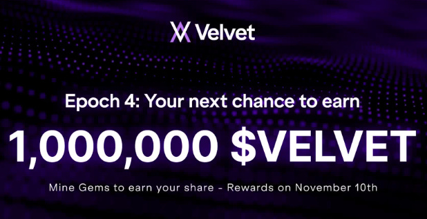 Epoch 4 is now with another 1,000,000 $VELVET in rewards for the most active and consistent users on Velvet. Your activity from October 10 through November 10 will determine your cut of the next distribution.