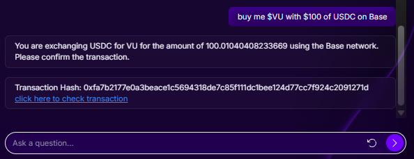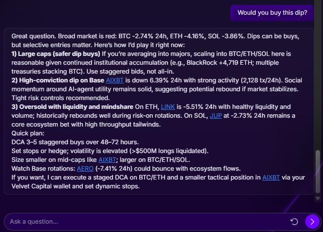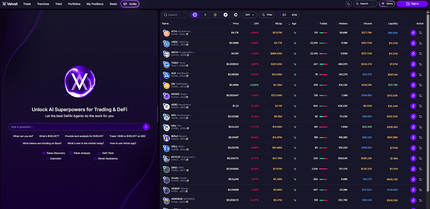 Think of it as your personal co-pilot for crypto. Velvet doesn’t just chat, it acts across your whole journey: