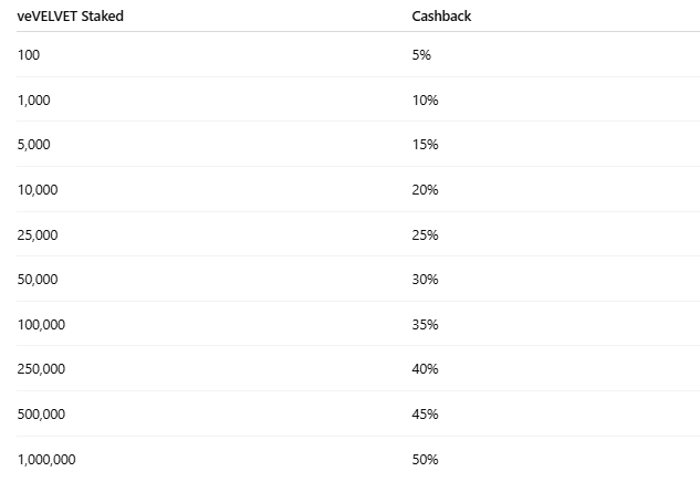 Earn up to 100% Cashback when trading on Velvet: Based on veVELVET and 30d Volumes