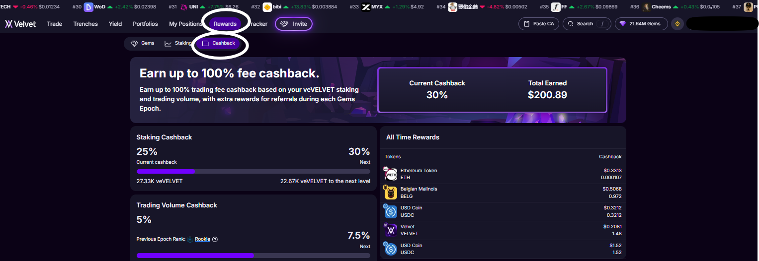 Staking veVELVET earns ongoing fee cashback. Balances are evaluated daily and cashback updates automatically.