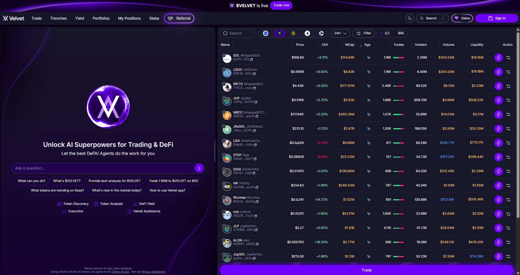 We launched our multi-agent AI system, launched rewards on Solana, shipped new design upgrades, and brought $VELVET trading to Coinbase users via Aerodrome.