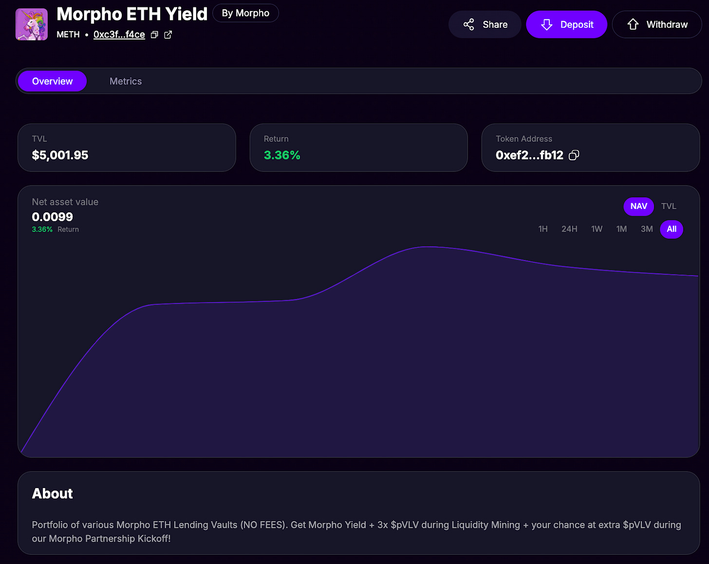 Check out the “Morpho ETH Yield” Portfolio: https://dapp.velvet.capital/VaultDetails/0xef2a90ced4615dd025dd86eeccef26184522fb12
