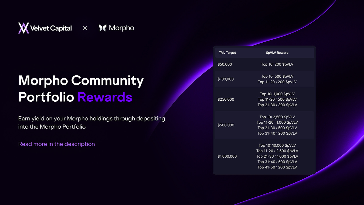 At Velvet Capital, we continuously evolve to bring our users the best DeFi solutions. Today, we are excited to announce a powerful new integration with Morpho, a leading DeFi lending protocol. This collaboration aims to enhance yield optimization across both platforms, offering Velvet Capital users access to Morpho Vaults, which is known for its efficient capital allocation and superior returns.
