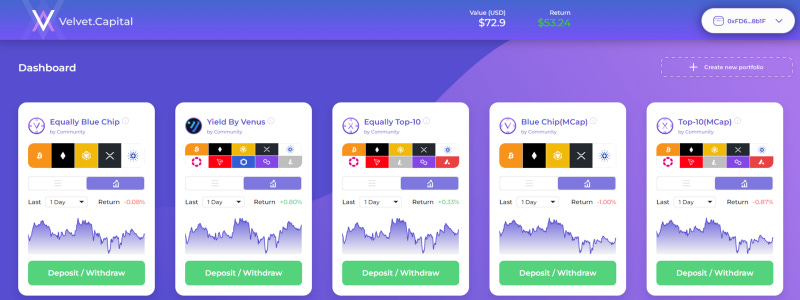 Velvet.Capital is committed to bringing DeFi to the masses with a multi-chain DeFi protocol that helps users create crypto portfolios, indexes and other financial instruments incorporating modern portfolio theory and highly vetted yield farming to deliver additional yield potential — all in just a few clicks.
