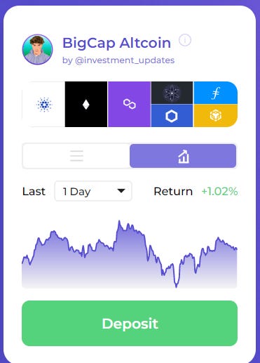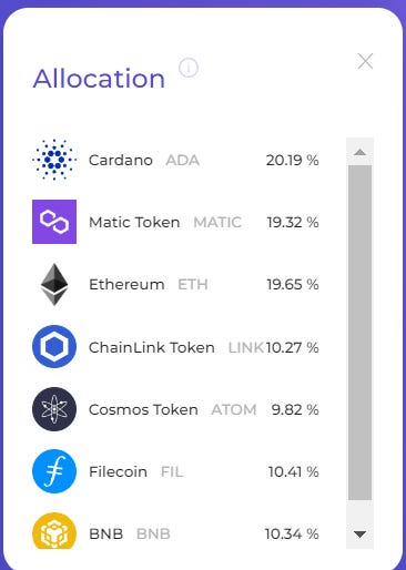 Holdings: 20% ETH, 20% ADA, 20% MATIC, 10% BNB, 10% LINK, 10% ATOM, 10% FIL