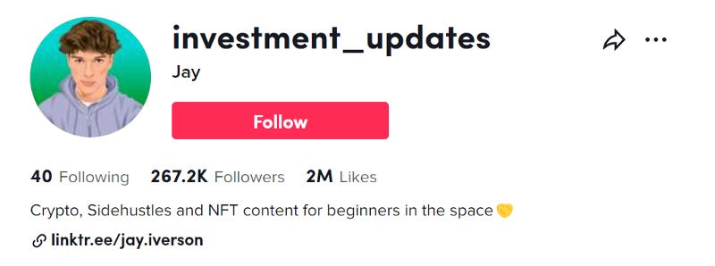 Jay has been creating Cryptocurrency Tik Tok content since February of 2021 and has gained a massive following because of the info he provides.