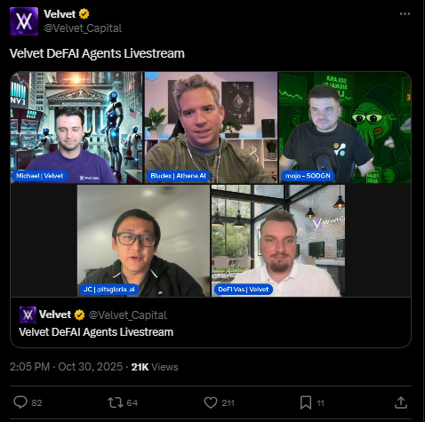 Hosted our second DeFAI Agent livestream with speakers from Velvet Unicorn, Athena AI, Gloria, and SQDGN. Sharing alpha on all the agents, discussing Velvet’s DeFAI OS, and discussed the overall market from the perspective of some top builders.