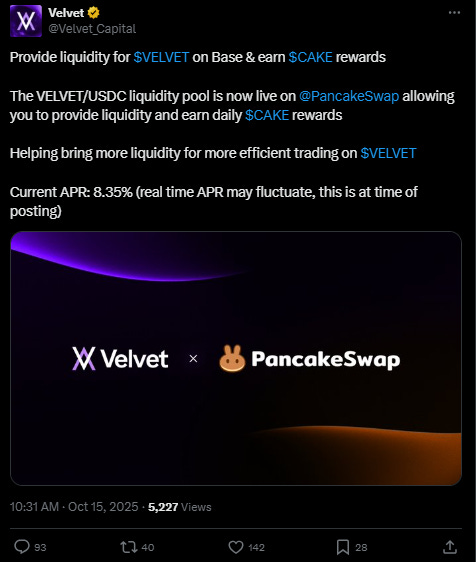 The new $VELVET–BNB pool on PancakeSwap went live with onchain rewards for LPs and more integrations on Base.