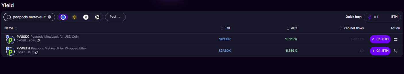 We’re excited to announce that Peapods Metavaults are now integrated into Velvet - giving you one-click access to yield-optimized Metavaults directly from the Velvet Yield page on Base and Ethereum.